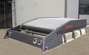 Durchstieg zum Fahrerhaus mit Gegenrahmen und Deckel zum Aufbau auf dem Fahrzeug Preis ab Werk 700,00€ incl. Mwst. Kein Versand nur in Verbindung mit Dachzelt Roofrack zur Montage in Verbindung mit Space Camp I. Space Pack stellt die optimale Ergänzung in Kombinationen Space Camp I auf Fahrzeugen mit langem Radstand wie z.B. Defender 110 dar. spacePACK bietet auf 650mm Länge über die Gesamtbreite des Fahrzeugs eine Staumöglichkeit für alles was im Fahrzeug keinen Platz findet. Zur Aufnahme der Lasten stehen insgesamt 4 C-Profile zur Verfügung. Space Pack verfügt zudem über die Möglichkeit Zusatzscheinwerfer innerhalb des Frontbleches geschützt und blendfrei zu montieren. Als Werkstoff wurde auch hierbei auf Riffelblech in AlMg3 zurückgegriffen.Front und Seitenteile bestehen aus einem Stück ohne überflüssige Schweißnähte und sind somit auch größten Belastungen gewachsen. Preis ab Werk 900,00 € incl. 19%Mwst. zzgl. Versandkosten Optionen Doppelscheinwerfer integriert in spacePACK