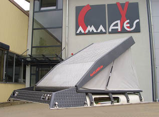 Abmessungen L=2250, B=1330, H=220 Gewicht ca. 52 Kg. Dachschale und Basiswanne aus AlMg3 Wandstärke 2,5 mm. Dach und Bodenwanne isoliert und mit grauem Feinripptepich verkleidet. Die Befestigung ist an allen gängigen Regenrinnen mittels 8 massiven Fusstützen aus AlMg3 8mm und 4 C-Trägerprofilen aus Edelstahl möglich. Dem Dachzelt sind hierbei fahrzeuspezifische Stützfüsse zur optimalen Anpassung des Dachzeltes an die Form des Farzeugdaches beigefügt. Die Klemmung erfolgt mit dem geschützen CAMA OnePinSystem (OPS) hierbei wird je nach Fahrzeugtyp eine spezielle Fußsstütze zur optimalen Anpassung des Dachzeltes an die Form des Fahrzeugdaches verwendet. Die Dachschale besteht aus Aluriffelblech 2,5mm eloxiert und ist begehbar. Zur Befestigung von Equipement sind dachseitig zwei seitliche Zurrschienen vorgesehen. Seitenteile, Boden und Stützen sind pulverbeschichtet nach RAL7024 . Preis ab Werk 4200,00 € incl. 19% Mwst. zzgl. Versandkosten, per Spedition Ausführung wie Space Camp I jedoch mit einer Gesamtlänge von 2700 mm insbesondere für Fahrzeuge mit langem Radstand geeignet. Preis ab Werk 4300,00 € incl. 19% Mwst. zzgl. Versandkosten, per Spedition Zurrschiene beidseitig Aluminium 2700 lang auf Dachschale montiert Preis ab Werk 172,00 € incl.Mwst. Kein Versand nur in Verbindung mit Dachzelt